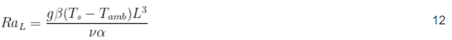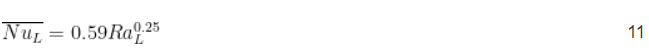 Der konvektive Wärmewiderstand ist der Grad, in dem durch Luftbewegung Wärme von der Oberfläche einer Platte abgeführt wird. Für eine beheizte vertikale Platte mit natürlicher Konvektion wird die dimensionslose Nusselt-Zahl (Nu) [2] aus Gleichung 11 abgeleitet. Die Nusselt-Zahl ist eine dimensionslose Variable, die in Konvektionsberechnungen verwendet wird.