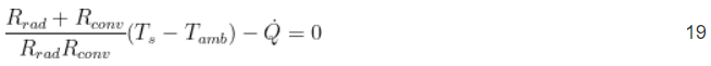 Die Werte von R rad , R conv und R sp können nicht direkt gelöst werden, da sie eine Funktion der Plattenoberflächentemperatur T s sind . Unter der Annahme, dass die gesamte von der Wärmequelle erzeugte Wärme vom Flachheizkörper abgeführt wird, lautet die Energiebilanzgleichung Gleichung 19.