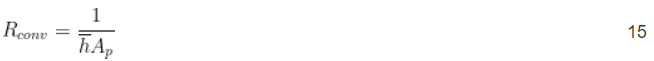 Der durchschnittliche Konvektionskoeffizient wird nach Gleichung 14 berechnet. Der konvektive Wärmewiderstand R conv ist eine Funktion der Plattenoberfläche A p und des durchschnittlichen Konvektionskoeffizienten, berechnet nach Gleichung 15. Beachten Sie, dass die Plattenoberfläche nicht die durch die Plattendicke erzeugte Fläche umfasst, da diese viel kleiner ist als die Vorder- und Rückseite.